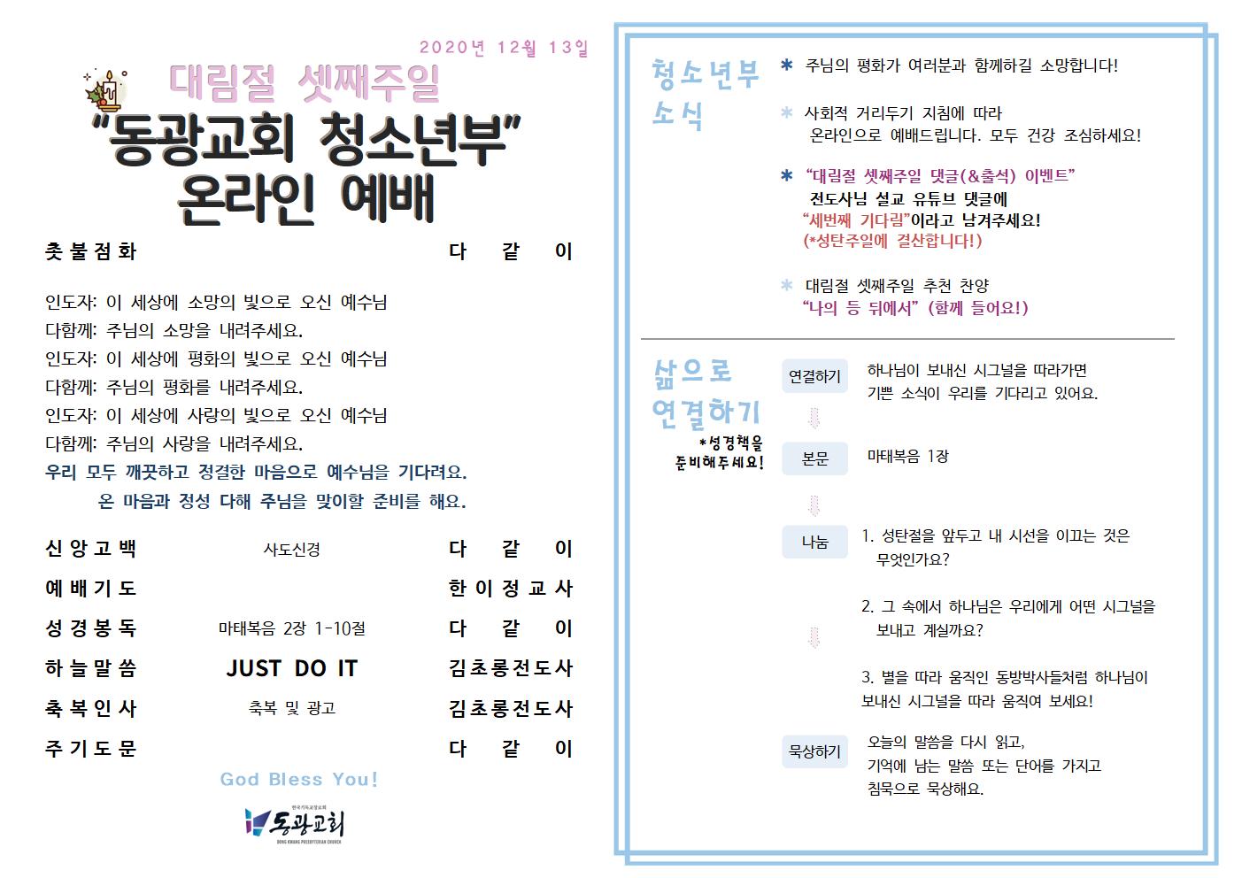 2020년 12월 13일 대림절 셋째주일 청소년부 온라인예배 순서지